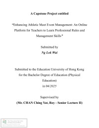 Background: Athletic meet is an important event in both primary and secondary school. Generally, the PE teacher assigns some of the referee position to other non-PE subjects teachers. However, most of these teachers lack knowledge related to track and field officiating. Although there are some written instructions on managing referee duties, these do not specifically address athletic meets and the content is often too complex and difficult to understand. There appears to be a lack of a structured video introduction on online platforms designed to assist teachers in conducting athletic meets in schools.Aim: To create an online-platform which provides videos for in-service teachers , sharing ideas on how to organize and manage all of the track and field events in school athletic meets and basic rules in each event. These resources are provided with essential information that is easy to understand.Method: This online platform will benefit all school teachers. The capstone project is divided into five stages: i) Information collection, ii) Information analysis, iii) Video production, iv) Online platform construction, and v) Amendment.Conclusion: This online platform provides videos with professional knowledge of track and field rules and shares ideas on organizing each event. It gives in-service teachers a basic understanding of managing referee positions during athletic meets. This resource enhances the fluency of conducting athletic meets and reduces safety issues