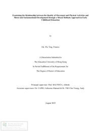 Background: Positive youth development (PYD) enhances socioemotional competencies, fosters positive traits, and promotes lifelong learning and balanced relationships (Lerner & Phelps, 2009). In early childhood, socioemotional competencies are foundational to PYD, while older children often engage in sports to promote these competencies. In contrast, movement and physical activities (MOPA) may be considered the counterparts of sports in early childhood curricula. In the Hong Kong social-cultural context, academic goals are often prioritized over physical development, neglecting the role of MOPA quality for young children. Despite education policies in Hong Kong prioritizing quality review mechanisms in kindergartens, MOPA quality has received limited attention. This dissertation examines MOPA quality and its relationship with young children's motor skills and socioemotional competencies.Methodology: This dissertation uses a mixed-methods design, integrating quantitative and qualitative components in a sequential framework (Quanti-Quali) across three studies. A qualitative narrative synthesis enriches the quantitative findings. The first study tested the internal consistency and test-retest reliability of the Movement Environment Rating Scale (MOVERS) based on observations conducted in one kindergarten. The second study is a quantitative observational study involving children from nine kindergarten classes, with 36 observations over four weeks using MOVERS to assess MOPA quality, the parent-proxy Ages and Stages Questionnaire (ASQ) to assess children’s motor skills, and the Social Competence and Behavior Evaluation Scale (SCBE-30) to assess children's socioemotional competencies. The third study employed a qualitative design, utilizing semi-structured interviews with kindergarten teachers.Results: The internal consistency of MOVERS was confirmed with Cronbach’s alpha of 0.88, indicating high reliability. The intraclass correlation coefficient (ICC) for test-retest reliability was 0.948 (p < 0.001), with weighted Kappa statistics averaging 0.914, indicating substantial agreement (82%). The average MOPA quality in Hong Kong kindergartens is 3.88 (SD = 1.461), below the good standard, with international kindergartens scoring higher. Multiple linear regression analyses show positive correlations between MOVERS subscales and ASQ and SCBE-30 subscales, with significant associations for ASQ (F (4, 149) = 6,322.721, p < .005) and SCBE-30 (F (4, 149) = 3,532.011, p < .005), particularly in promoting physical activity and fine motor skills. Significant correlations with socioeconomic status were found (ASQ: p < .001; SCBE: p < .001), while no correlations existed with gender (p = 0.877) or age (p = 0.858). Qualitative findings suggest that teachers in Hong Kong kindergartens are dissatisfied with the quality of MOPA, primarily due to an insufficient policy focus and inadequate professional training. The quality of MOPA in local schools is notably poorer than in international schools.Conclusion: This study reveals a positive correlation between MOPA quality and students' motor skills and socioemotional competencies. International kindergartens typically provide higher-quality MOPA, enhancing motor skills and socioemotional competencies. This dissertation presents empirical evidence of MOPA's positive impact on children's emotional and psychological development in Hong Kong kindergartens, thereby contributing to the literature on holistic development. The results refine theoretical frameworks regarding the relationship between MOPA quality and developmental domains, offering insights for future research
