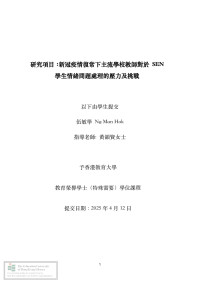 新冠疫情復常下主流學校教師對於SEN學⽣情緒問題處理的壓⼒及挑戰 /