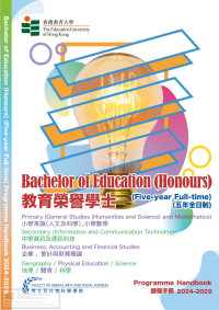 Education University of Hong Kong General Education OfficeProgramme handbook : Bachelor of Education (Honours)(Secondary)--Information and communication technology, Bachelor of Education(Honours)(Primary)--General studies and mathematics, Bachelor of Education(Honours)(Physical education), Bachelor of Education(Honours)(Secondary) in Mathematics, Bachelor of Education(Honours)(Business, Accounting and Financial Studies), Bachelor of Education(Honours)(Geography), Bachelor of Education(Honours)(Science) (Five-year Full-time) = 中學教育榮譽學士--資訊及通訊科技, 小學教育榮譽學士--常識及數學, 體育教育榮譽學士, 中學數學教育榮譽學士, 企業、會計與財務概論教育榮譽學士, 地理教育榮譽學士, 科學教育榮譽學士 (五年全日制)