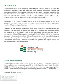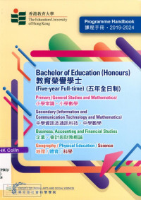 Education University of Hong Kong Faculty of Liberal Arts and Social SciencesProgramme handbook : Bachelor of Education (Honours)(Secondary)--Information and communication technology, Bachelor of Education(Honours)(Primary)--General studies and mathematics, Bachelor of Education(Honours)(Physical education), Bachelor of Education(Honours)(Secondary) in Mathematics, Bachelor of Education(Honours)(Business, Accounting and Financial Studies), Bachelor of Education(Honours)(Geography), Bachelor of Education(Honours)(Science) (Five-year Full-time) = 中學教育榮譽學士--資訊及通訊科技, 小學教育榮譽學士--常識及數學, 體育教育榮譽學士, 中學數學教育榮譽學士, 企業、會計與財務概論教育榮譽學士, 地理教育榮譽學士, 科學教育榮譽學士 (五年全日制)