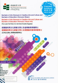 Education University of Hong Kong Faculty of HumanitiesProgramme handbook : Bachelor of arts (honours) in creative arts and culture and Bachelor of education (honours) (music), Bachelor of arts (honours) in creative arts and culture and Bachelor of education (honours) (visual arts) (five-year full-time) (co-terminal double degrees) = 創意藝術與文化榮譽文學士及音樂教育榮譽學士 創意藝術與文化榮譽文學士及視覺藝術教育榮譽學士(五年全日制) (同期結業雙學位)