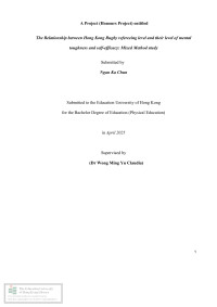 Ho, Cheuk KiuThe relationship between Hong Kong Rugby refereeing level and their level of mental toughness and self-efficacy : mixed method study /