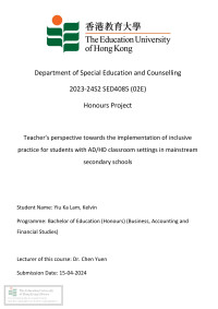 So, Hoi YiTeacher’s perspective towards the implementation of inclusive practice for students with AD/HD classroom settings in mainstream secondary schools /