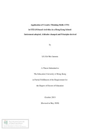 Chan, Chun HungApplication of creative thinking skills (CTS) in STEAM-based activities in a Hong Kong School : instrument adopted, attitudes changed and principles derived /