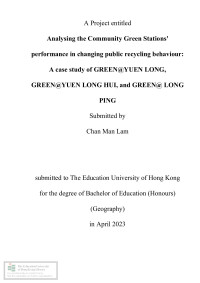 Lee, Ching SuetAnalysing the Community Green Stations' performance in changing public recycling behaviour : a case study of GREEN@YUEN LONG, GREEN@YUEN LONG HUI, and GREEN@LONG PING /