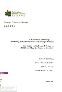 Lai, Kwok ChanA 'crucible of democracy' : promoting participatory citizenship amongst students : first report for the research project on HKICC Lee Shau Kee School of Creativity /