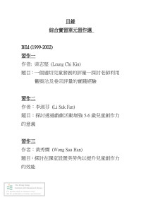 梁志堅 | 李淑芬 | 黃秀嫺 | 黃少君 | 邱玉月 | 周淑慧 | 張翠華 | 繆玉珍 | 黃倩雲A study on the provision of early childhood teacher education for serving teachers in Hong Kong and graduate performance of QKT and CE(KG) courses (1996-1999) of the Hong Kong Institute of Education