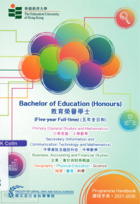 Education University of Hong Kong Faculty of HumanitiesProgramme handbook : Bachelor of Education (Honours)(Secondary)--Information and communication technology, Bachelor of Education(Honours)(Primary)--General studies and mathematics, Bachelor of Education(Honours)(Physical education), Bachelor of Education(Honours)(Secondary) in Mathematics, Bachelor of Education(Honours)(Business, Accounting and Financial Studies), Bachelor of Education(Honours)(Geography), Bachelor of Education(Honours)(Science) (Five-year Full-time) = 中學教育榮譽學士--資訊及通訊科技, 小學教育榮譽學士--常識及數學, 體育教育榮譽學士, 中學數學教育榮譽學士, 企業、會計與財務概論教育榮譽學士, 地理教育榮譽學士, 科學教育榮譽學士 (五年全日制)