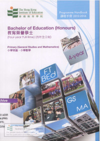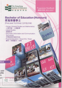 Hong Kong Institute of Education Faculty of Liberal Arts and Social SciencesProgramme handbook : Bachelor of Education (Honours)(Secondary)--Information and communication technology, Bachelor of Education(Honours)(Primary)--General studies and mathematics, Bachelor of Education(Honours)(Physical education), Bachelor of Education(Honours)(Visual arts), Bachelor of Education(Honours)(Music), Bachelor of Education(Honours)(Liberal studies) (Five-year Full-time) = 中學教育榮譽學士--資訊及通訊科技, 小學教育榮譽學士--常識及數學, 體育教育榮譽學士, 視覺藝術教育榮譽學士, 音樂教育榮譽學士, 通識教育榮譽學士 (五年全日制)