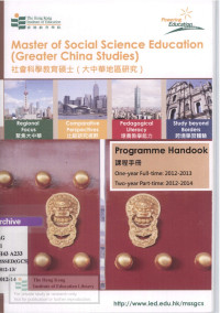 Hong Kong Institute of EducationProgramme handbook : Master of Social Science Education (Greater China Studies)(one-year full-time/two-year part-time) = 社會科學教育碩士(大中華地區研究)(一年全日制/二年部時間制)