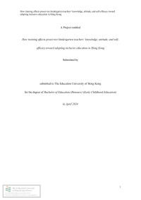 Leung, Yuen TungHow training affects preservice kindergarten teachers’ knowledge, attitude, and self-efficacy toward adopting inclusive education in Hong Kong /